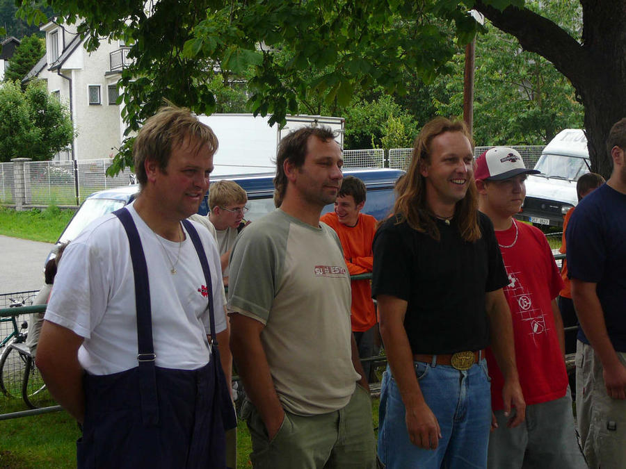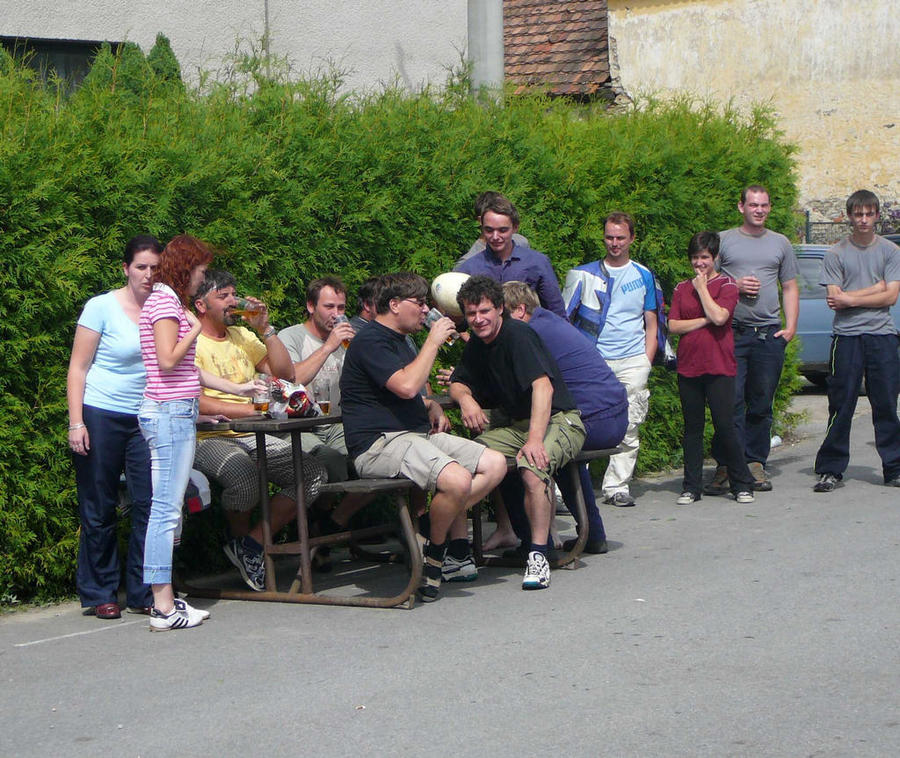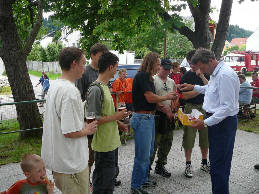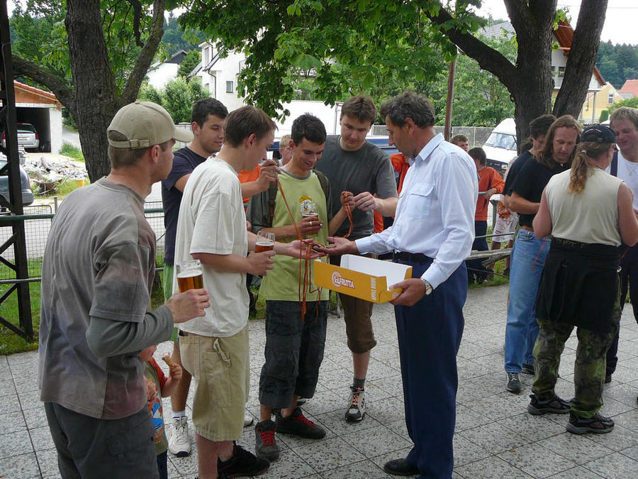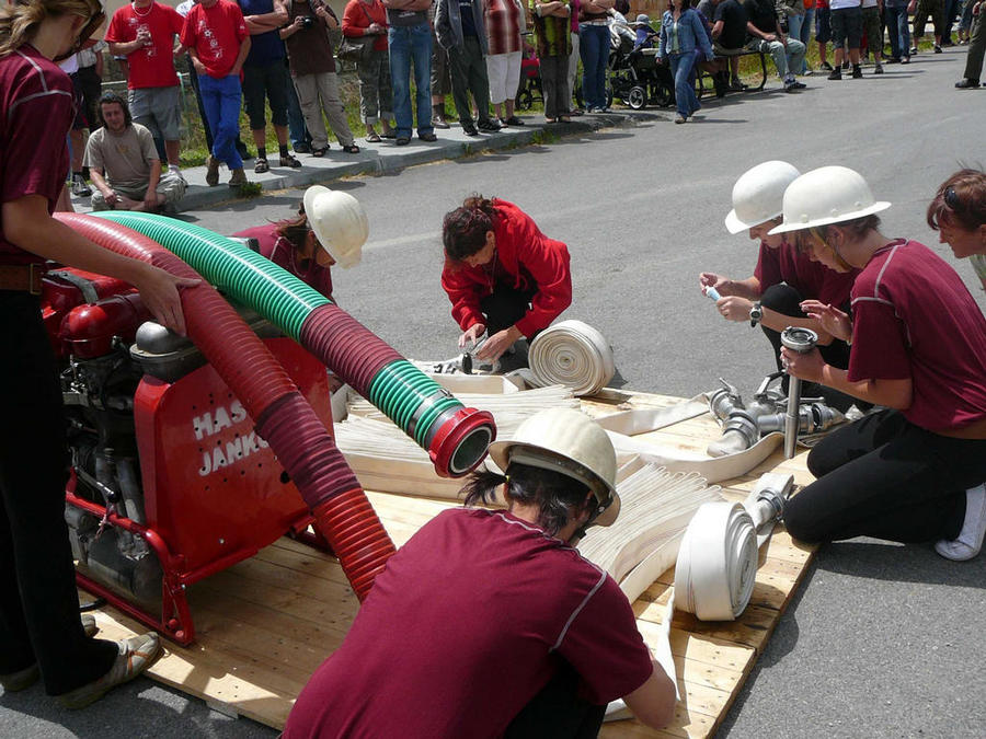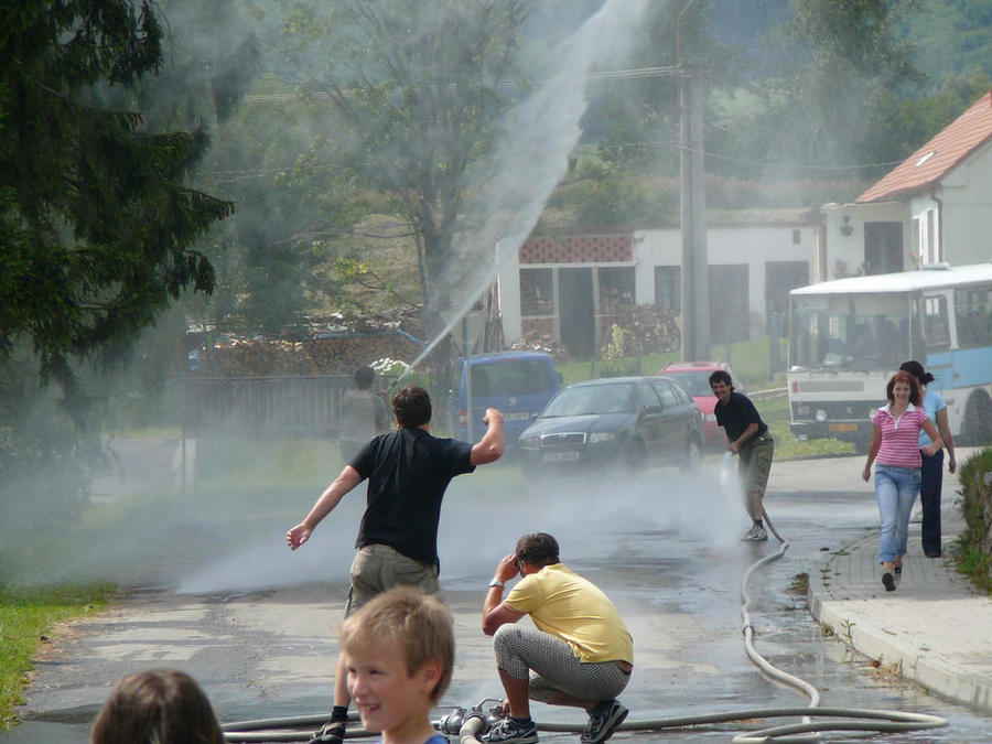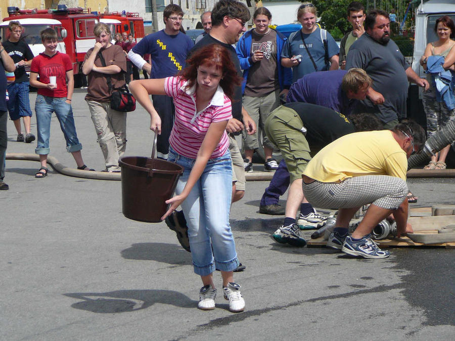 Po skončení soutěže družstev v požárním sportu si pár amatérských hasičů - nadšenců z Nové Vsi připravilo pro všechny přítomné malé překvapení. Předvedli "hasičskou záchrannou akci", která začínala volnou zábavou, pohodičkou a posezením u pivečka (první foto), poté někdo vykřikl "hoří" a osazenstvo u pivečka bylo požádáno o uhasení fiktivního ohně. Amaterští hasiči pivo dopili, poté se odebrali hasit oheň (hasičská technika používaná také při oficiální soutěži družstev jim byla zapůjčena), ženy vyběhly hasit oheň s kýbly naplněnými vodou (na druhé fotografii je zachycena Vlaďka Bauerová při hasičské "akci s kýblem"). Fiktivní oheň se podařilo uhasit ( třetí foto) a amatérští hasiči byli za tuto "perličku" na závěr soutěžní části oslav 120. výročí založení sboru odměněni velkým potleskem a jásotem přihlížejících.