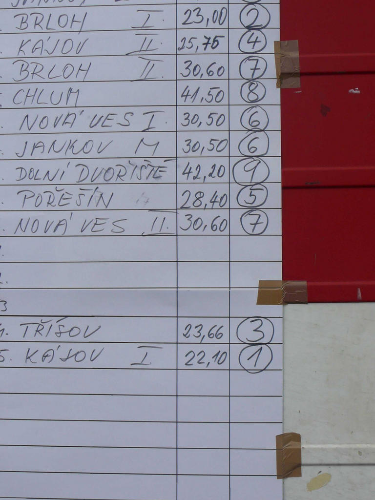 Výsledné pořadí družstev mužů bylo následující: 1. místo - Kájov I., 2. místo - Brloh I., 3. místo - Třísov, 4. místo - Kájov II., 5. místo - Pořešín, 6. místo - Nová Ves I. a Jankov, 7. místo - Nová Ves II. a Brloh II., 8. místo - Chlum, 9. místo - Dolní Dvořiště.