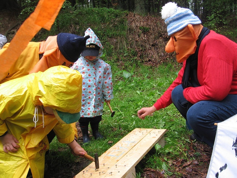 Na začátku pohádkového lesa pomáhaly děti postavičkám z pohádky Pat a Mat zatlouct hřebíky: