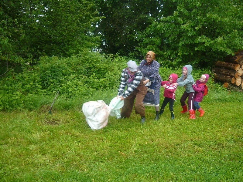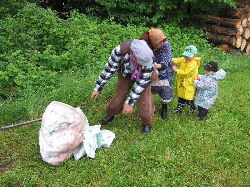 Na konci pohádkového lesa byli babka s dědkem z pohádky O veliké řepě, kde děti pomáhaly tahat řepu: