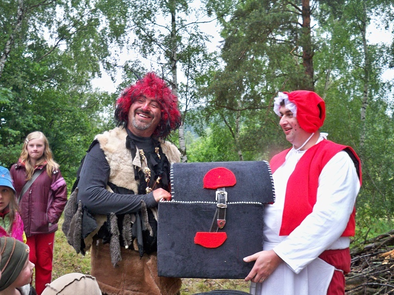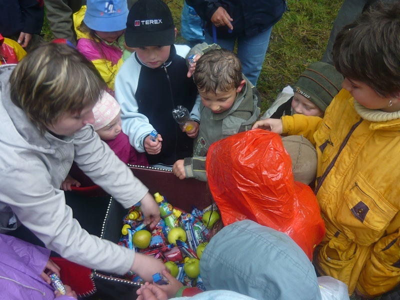 Na závěr čekalo děti další překvapení. Dověděly se, že je nedaleko ukryt poklad plný dobrůtek. Ihned se vydaly ho hledat. Byl ale hodně těžký, tak jim ho pomohli nést čert s Karkulkou a o dobroty z pokladu se děti podělily: